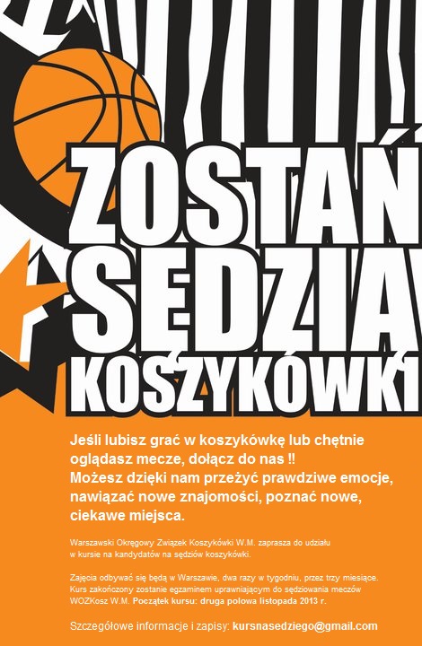 Kolegium Sędziów WOZKosz W.M. zaprasza do udziału w kursie sędziowskim. Zgłoszenie należy wysłać drogą mail-ową na adres:kursnasedziego@gmail.com